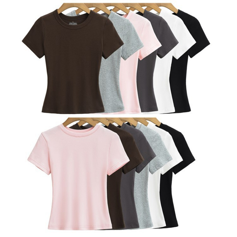 卸売策略ラウンドネック半袖 Tシャツ女性のための 2024 夏の新しいスタイル右肩ベーシックソリッドカラースリムカーダシアンスタイルトップ