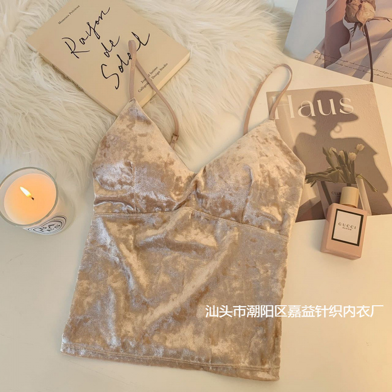 8305 # 秋冬の金のベルベットの厚い毛磨きのキャミソールの固定カップの一体下着の小さい香りの風のセクシーな保温