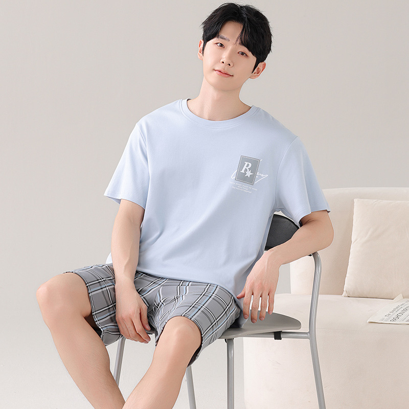 純綿パジャマ男性夏半袖半ズボン薄手青年レジャー運動シンプル丸首家庭服
