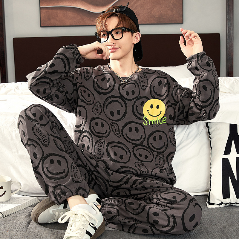 新商品の純綿男性家庭服カジュアルファッション丸首漫画長袖セット青年男の子パジャマ外着可