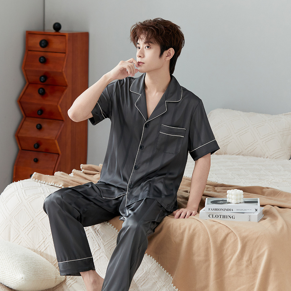 夏と秋の男性用の新しいアイスシルクパジャマ、シンプルで高級感のある春と秋の薄いジャカードスリーピースホーム服、屋外で着用可能