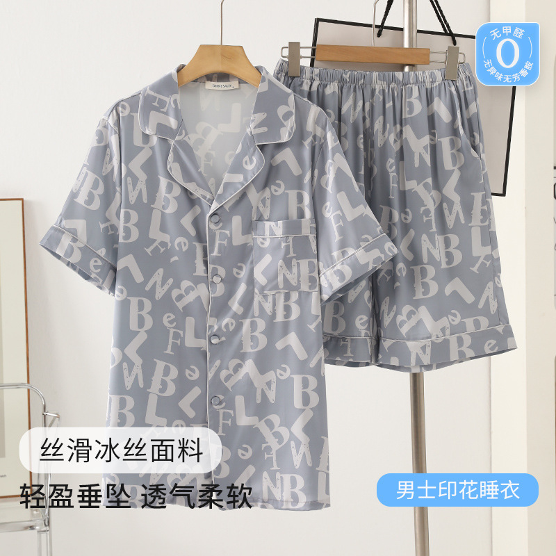 パジャマメンズ夏の新しいプラスサイズ半袖ショーツハイエンドプリントアイスシルク薄い男の子ホーム服セット
