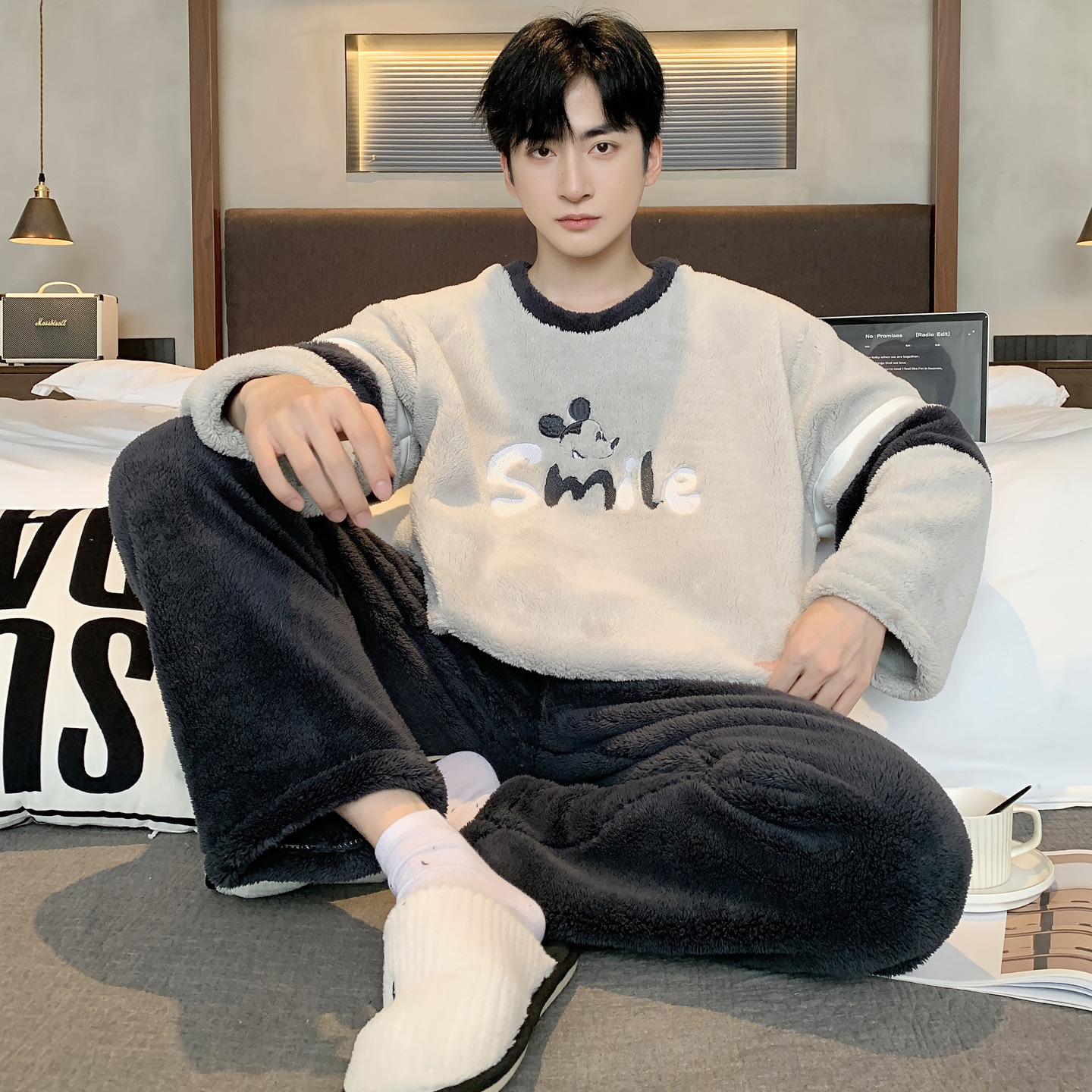 パジャマ男性は冬に保温サンゴのベルベットの家庭服を厚くするファッション青少年男性フランネルセットの新型