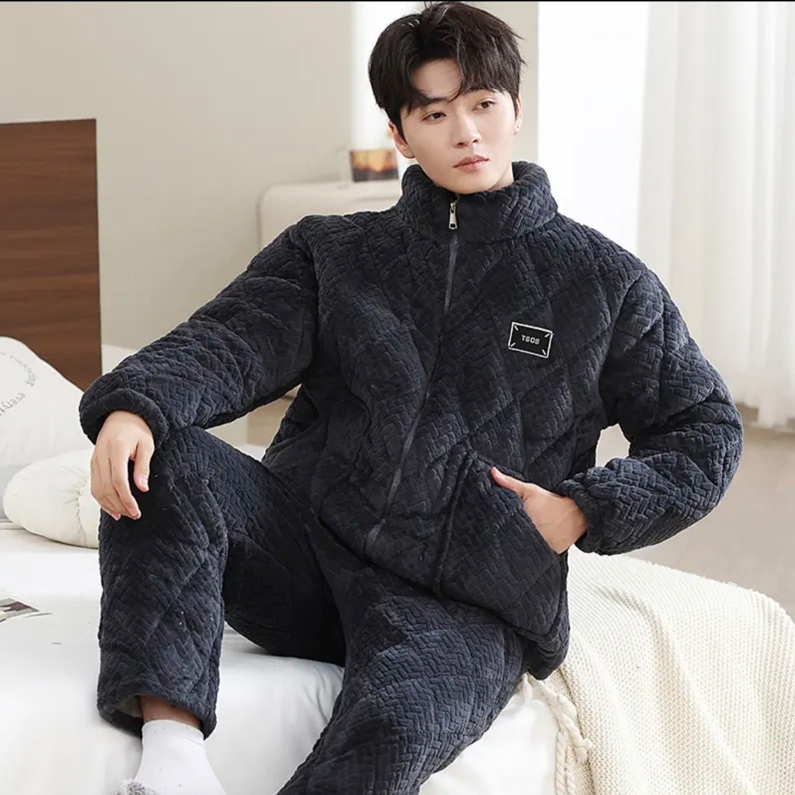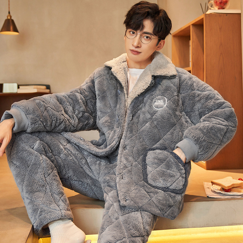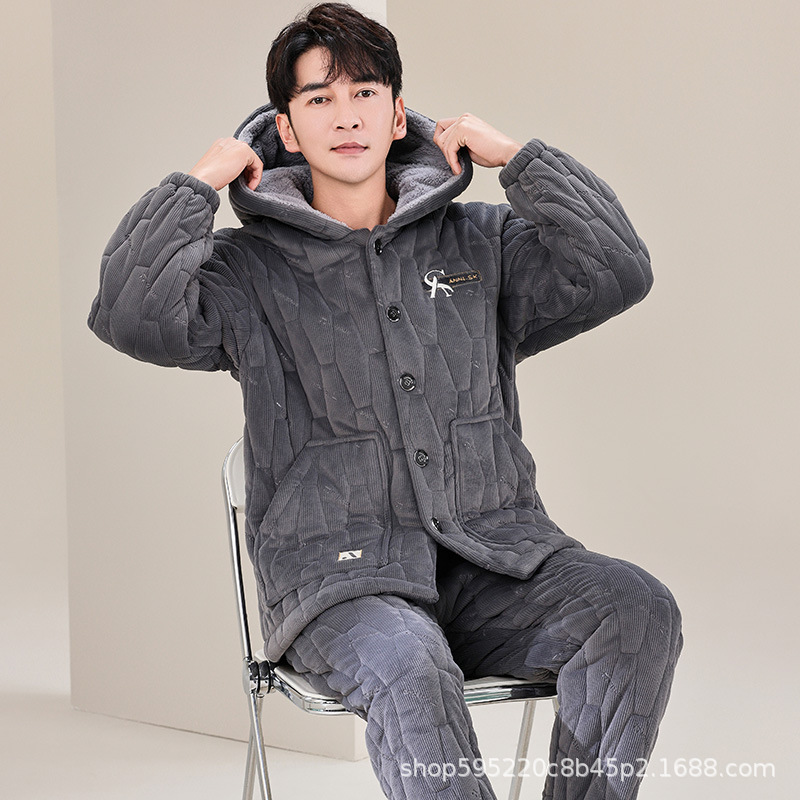 三層綿入りパジャマ男性は秋冬にベルベットのベルベットのカーディガン青年保温フランネルの家庭服を厚くする
