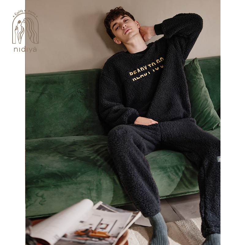 ニディヤの新しいパジャマ男性は冬に保温サンゴのベルベットの丸首を厚くしてカジュアルな家庭服セットを着ている