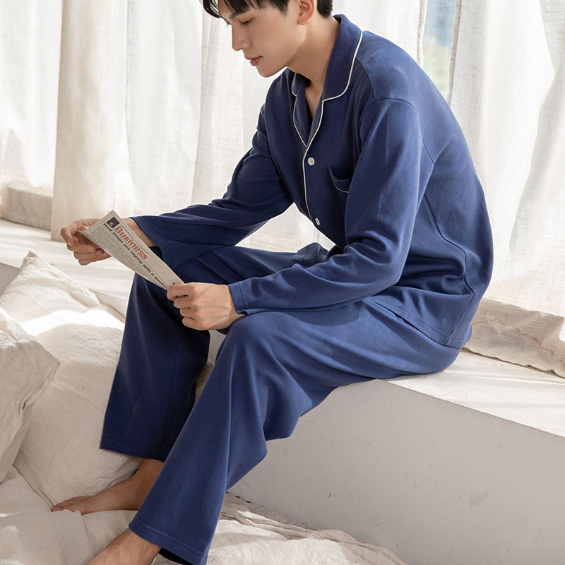 秋冬新作メンズパジャマ長袖純綿カーディガン襟付き無地カジュアル綿100%大きいサイズホームウェアメンズセット