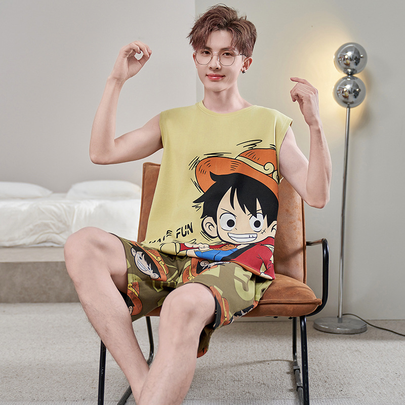 純綿ベストパジャマ男性漫画学生ティーンエイジャーノースリーブ綿大きいサイズ夏の漫画ホーム服セット
