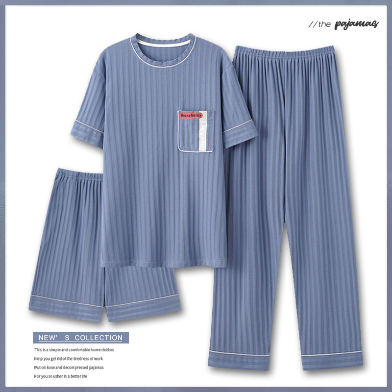 夏の雲綿糸パジャマ男性三点セット青年男性半袖長ズボン縮み薄い家庭服セット