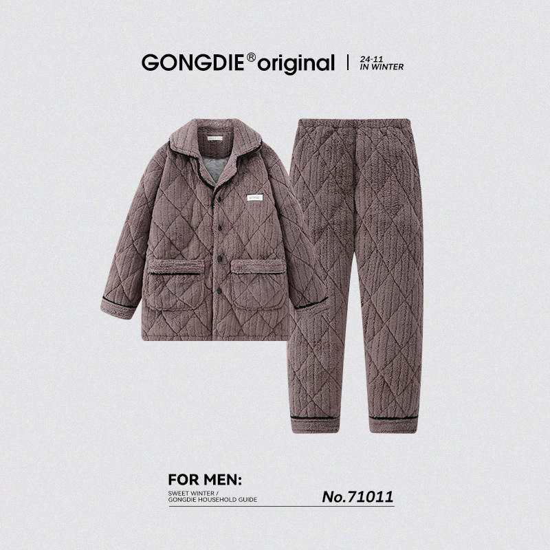 冬用コーラルフリース三層保温綿入りメンズホームウェア長袖襟付きパジャマセット厚手保温