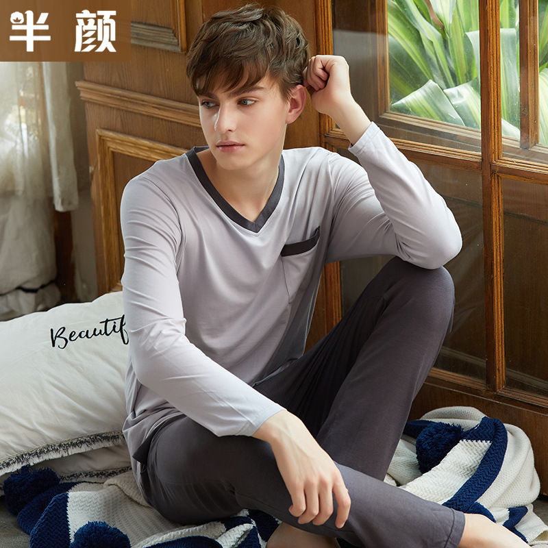 在庫処分 超ソフトニットモダールコットン メンズVネックカジュアルエレガント長袖長ズボン 春秋ホームウェア