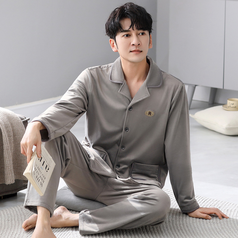 秋冬メンズ新作綿起毛スーツ襟ボタン付きパジャマ上下セット暖かい