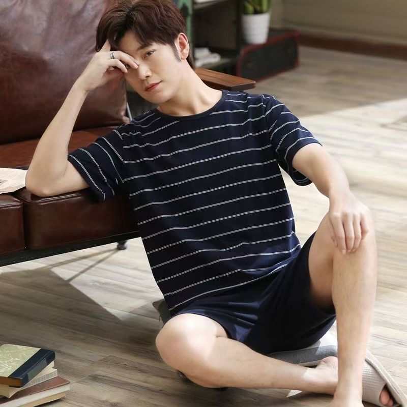 模造綿パジャマメンズ夏半袖ショーツティーンエイジャー学生漫画ストライプ夏のホームウェアセット卸売