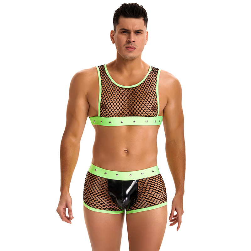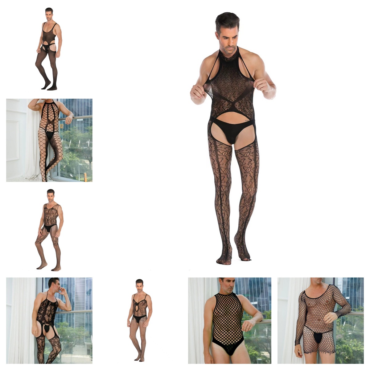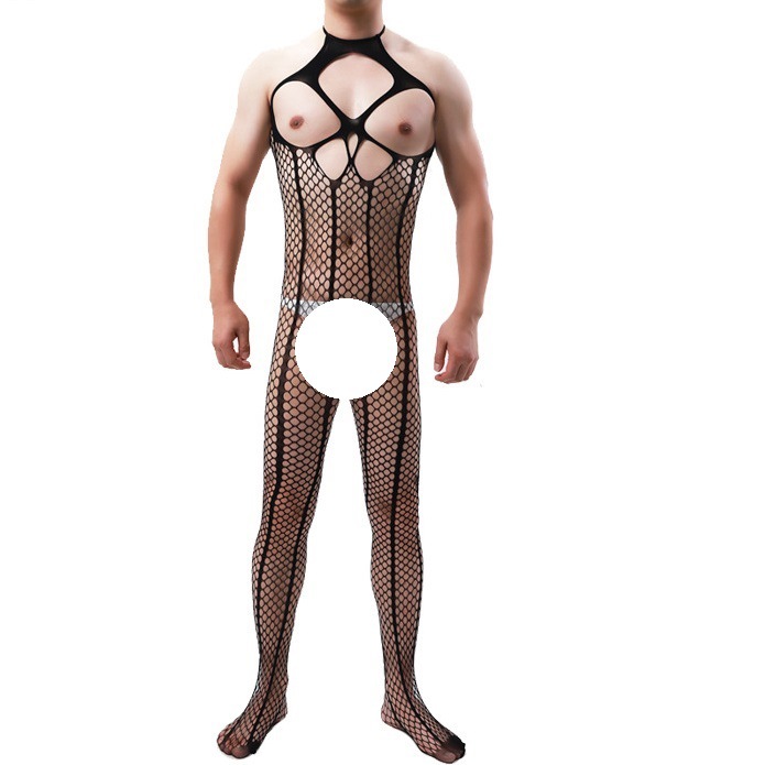 男性の連体の趣味の下着の連体のネットの服の透かし彫りの透視は欧米のクロスボーダーのアマゾンの対外貿易の夜店の男性のモデルの服です。