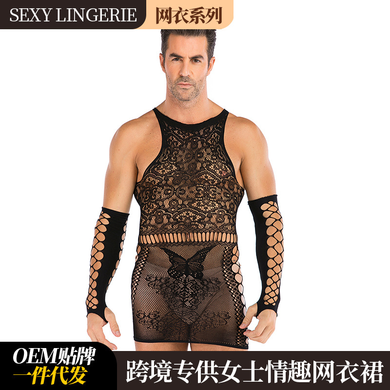クロスボーダーの下着の男性のワンピースの袖なしのオープンのセクシーなパジャマの趣味の全身のネットの服の男性のストッキング