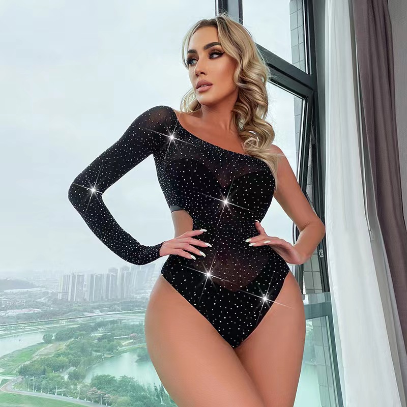 趣味の下着の新型欧米のクロスボーダーのシングル肩の漁網の明るいドリルのドリルのネットの服の制服は連体の服のアマゾンを誘惑します。