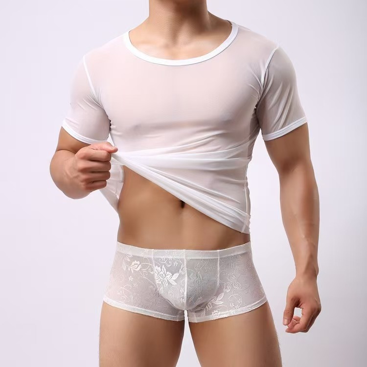 外国貿易アマゾンの趣味下着男性半袖ネット糸通気性セクシー丸首シャツメーカー卸売り