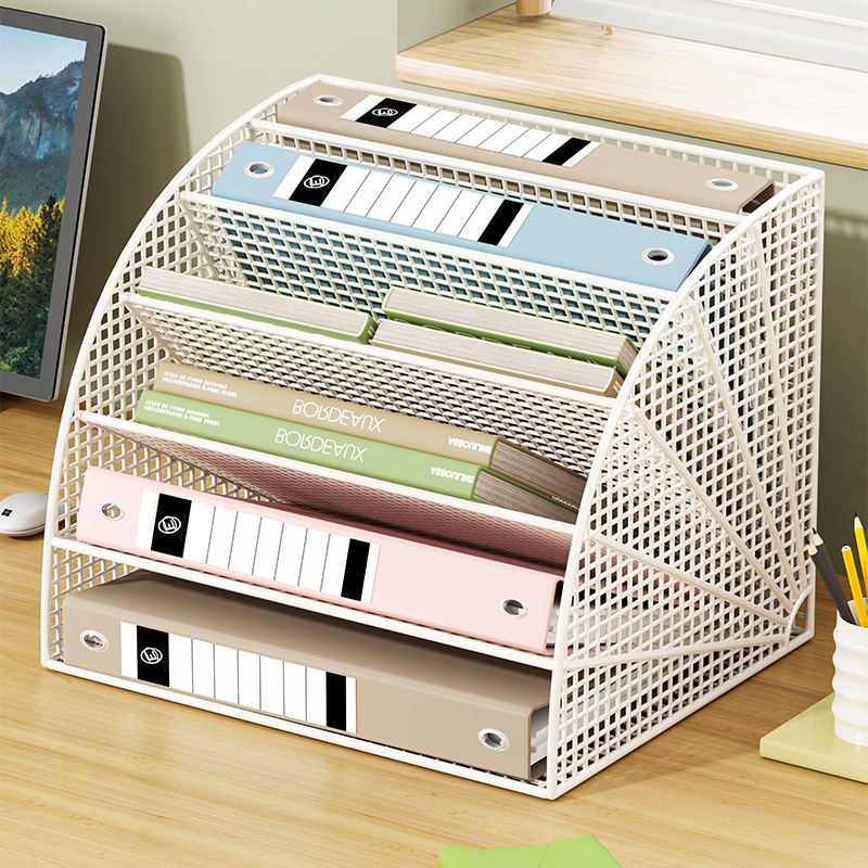 事務机の物置棚のデスクトップの収納箱の事務室の多層のファイル棚のステーションの雑物の事務用品の収納かご