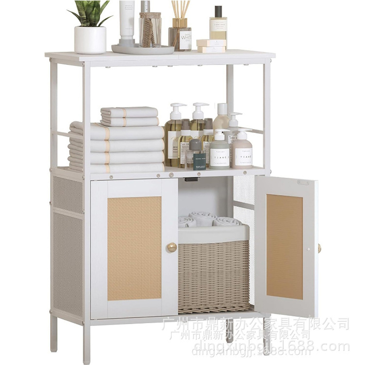 籐ドア付きバスルームフロア収納キャビネット メタルフレーム付き自立型バスルームキャビネット コーヒーバーホルダー
