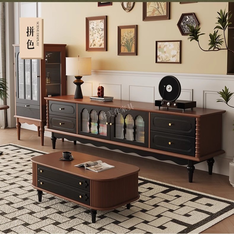 フレンチレトロ無垢材テレビキャビネットとコーヒーテーブルの組み合わせ小さなアパートのリビングルームホームオーディオビジュアルキャビネット床置き収納ロッカー