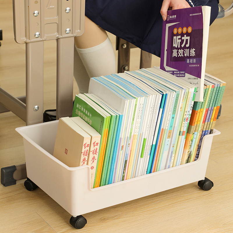 机の下の本棚の本の収納箱の学生寮のテーブルの上の物置棚はかばんの着地のプーリを置いて本の箱を移動します。