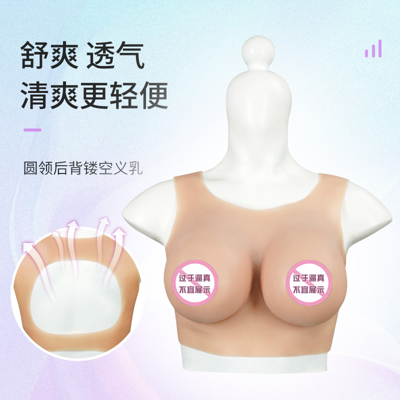 ラウンドネック、背中中空、短い義乳、粗い質感、男性から女性への女装、女装用シリコン偽乳