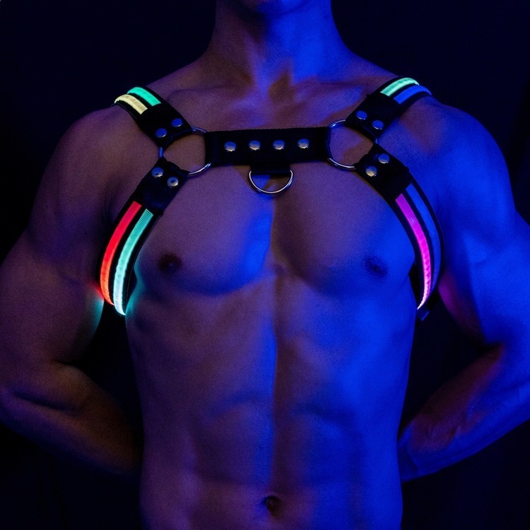 D.m男肩ひもセクシー調光ライトステージ点滅充電式カラーライトベルト胸ひも欧米筋肉誘惑