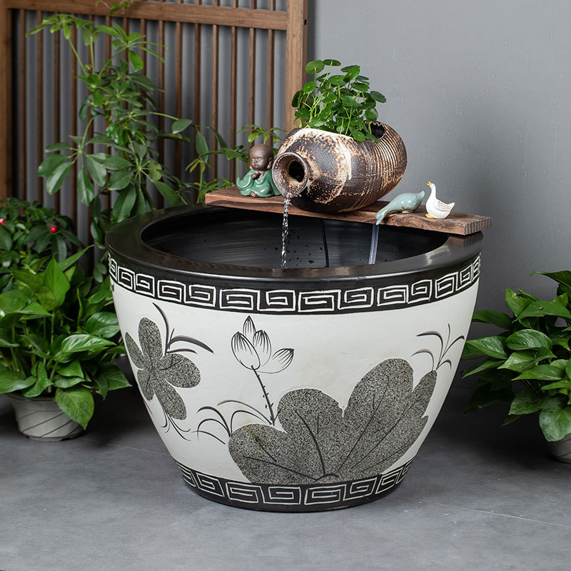 陶磁器の大きいかめの古法の養魚のかめの客間のベランダは地面に落ちます。