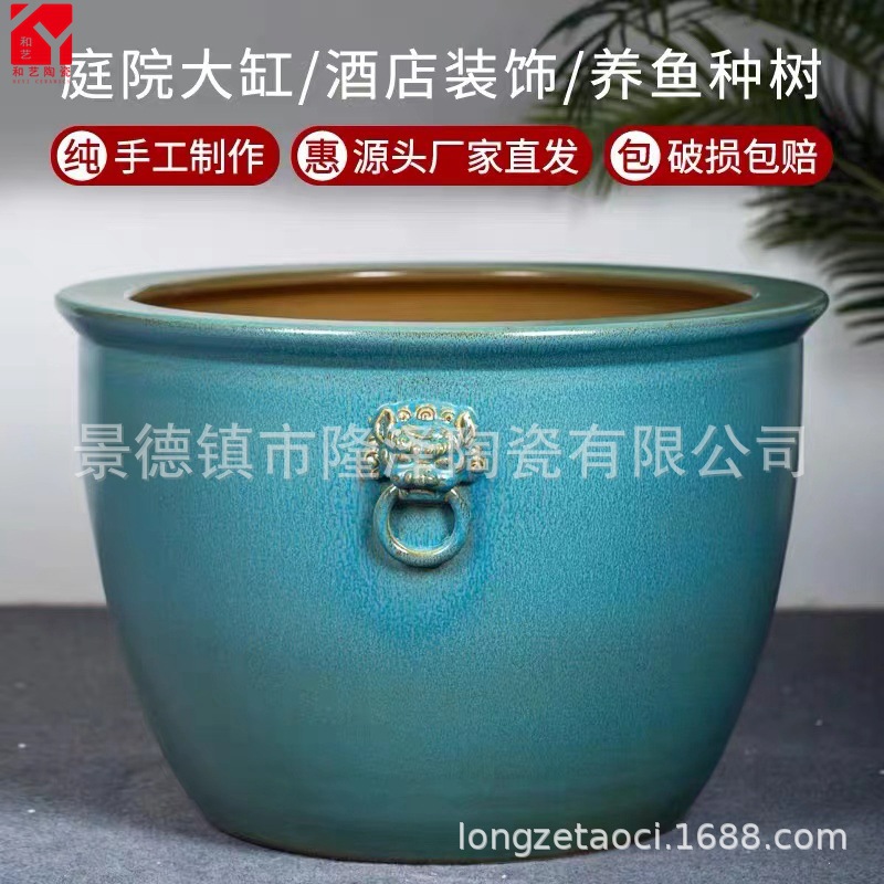 青釉の獅子の耳のかめのハスの花の水筒の睡蓮の陶磁器の水槽の特大サイズは古の獅子の頭の庭の陶磁器の大きいかめをまねます。