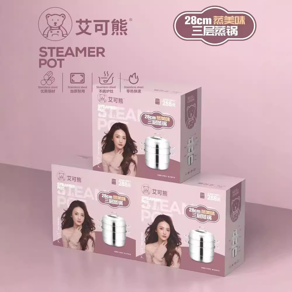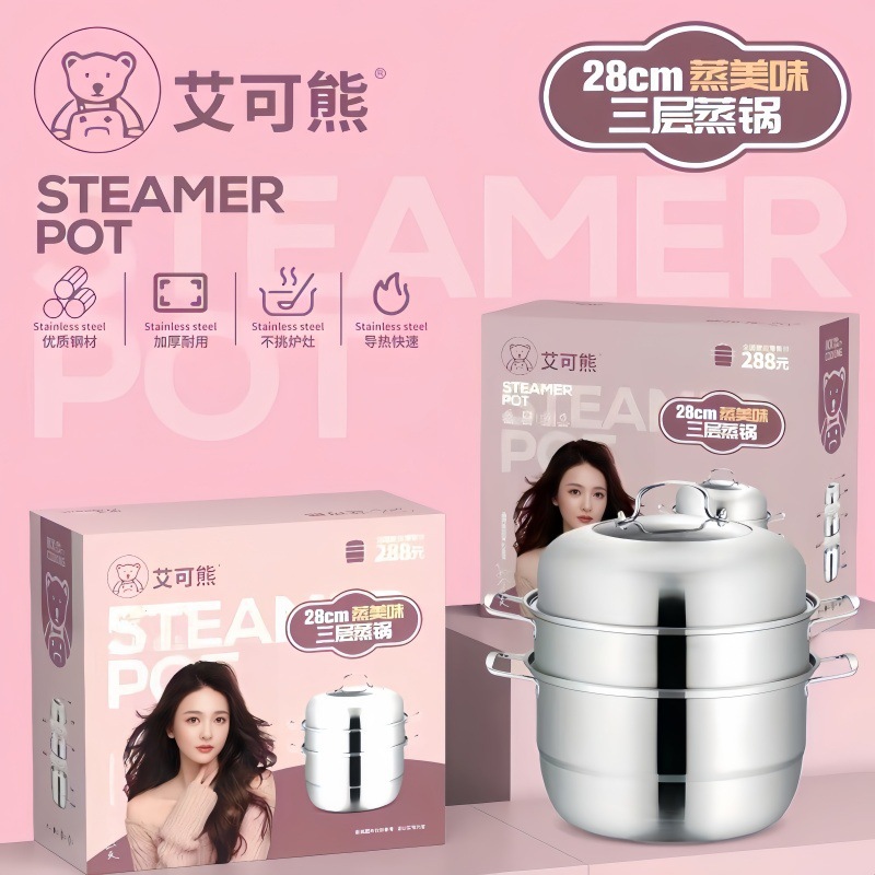 アコ熊28cm蒸しおいしい三層蒸し器家庭用多機能ステンレス蒸し器店慶節プレゼント卸売り