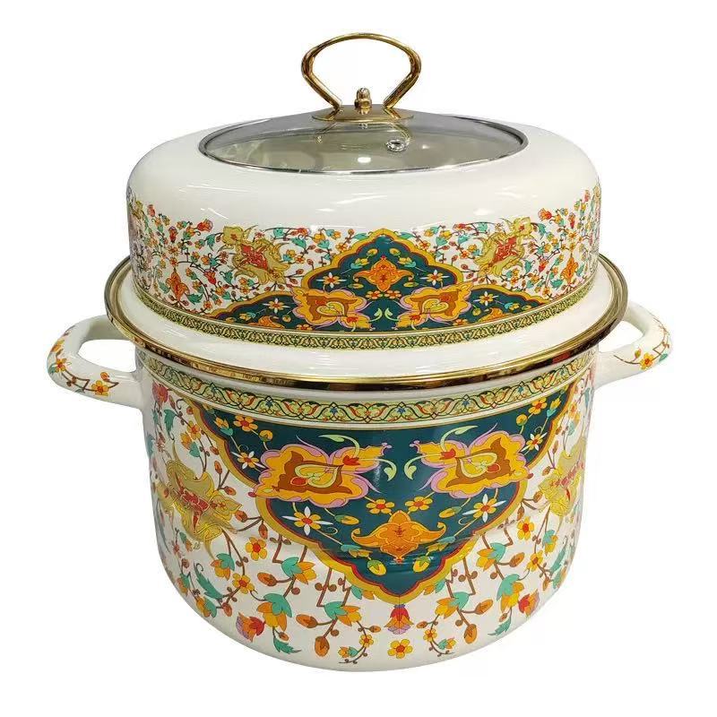 【エナメルエナメル二重蒸し器可視蓋エナメルシチュー鍋大容量電磁炉ガス二重可視蒸し器