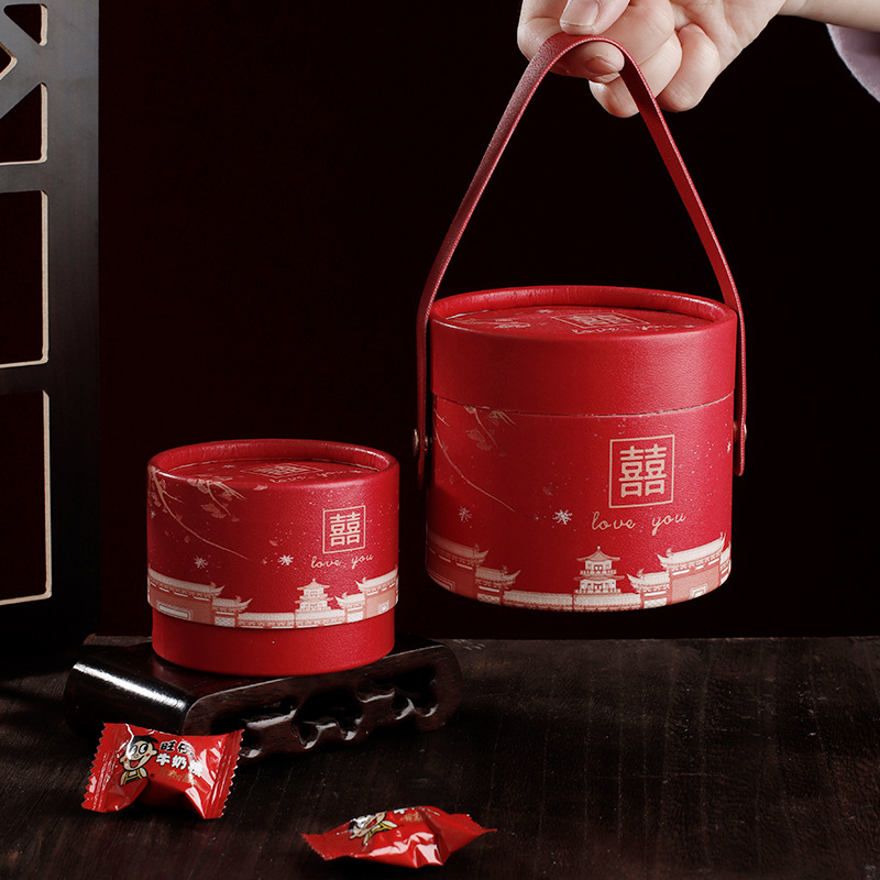 結婚式の丸い桶の真珠の喜糖の箱の結婚の高級なお土産のシンプルな赤い手提げの箱