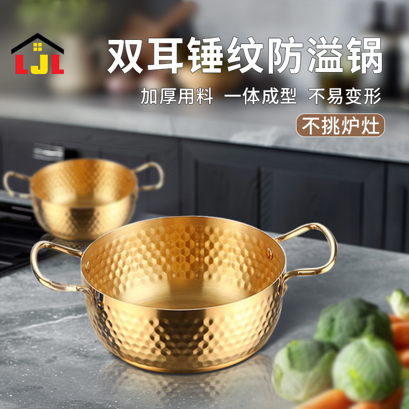 金色の両耳のステンレスの雪平鍋のハンマーの紋様の韓国式のカップラーメンの鍋の乳鍋は鍋の電磁ストーブのガスコンロにくっつかないで通用します。