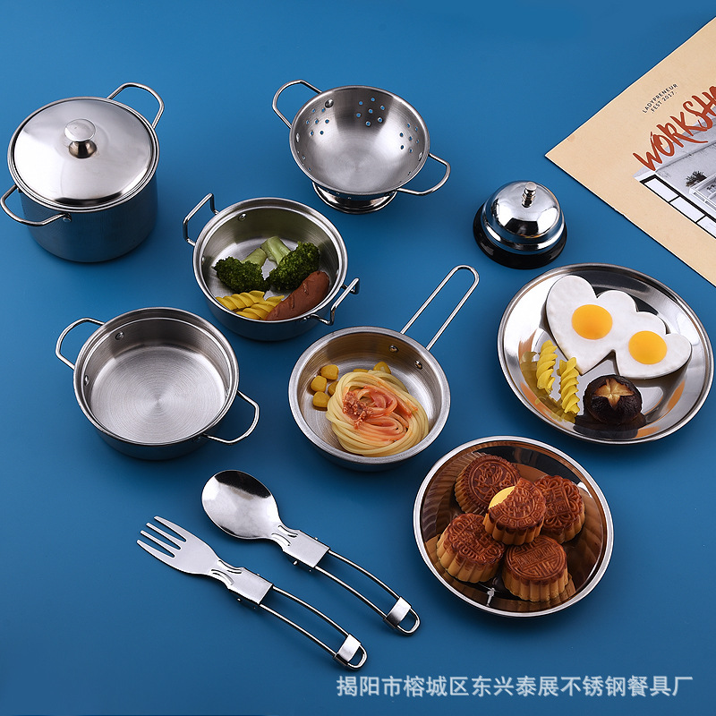 人気のある子供のままごとキッチンセットステンレスミニ食器調理器具玩具折り畳み食器