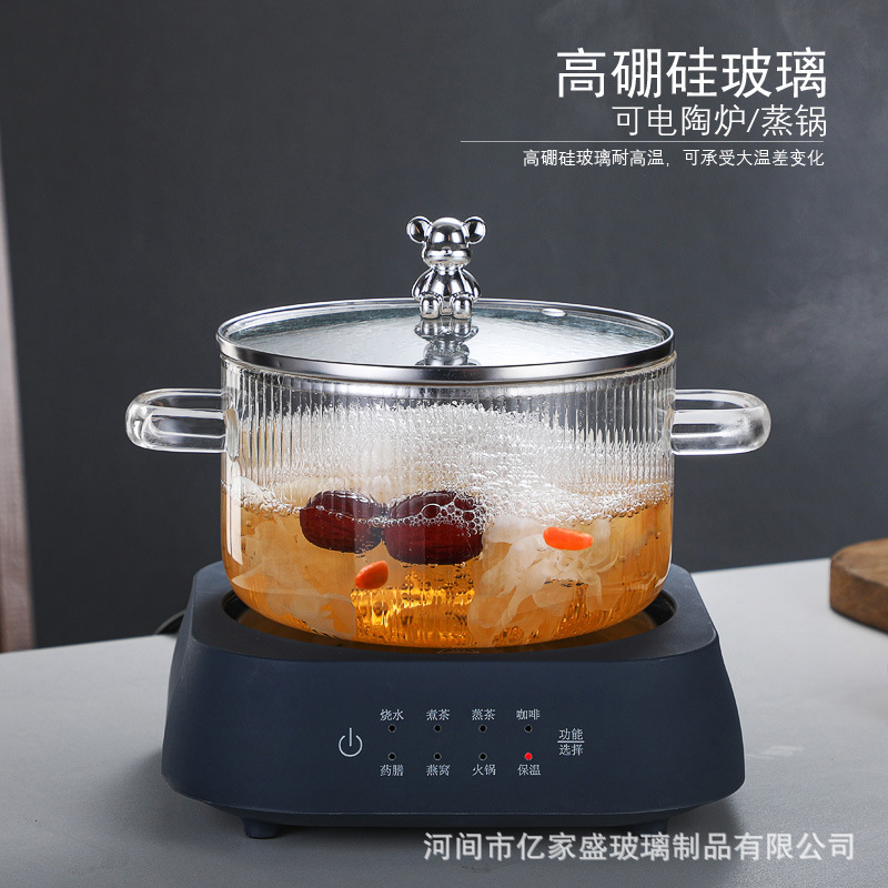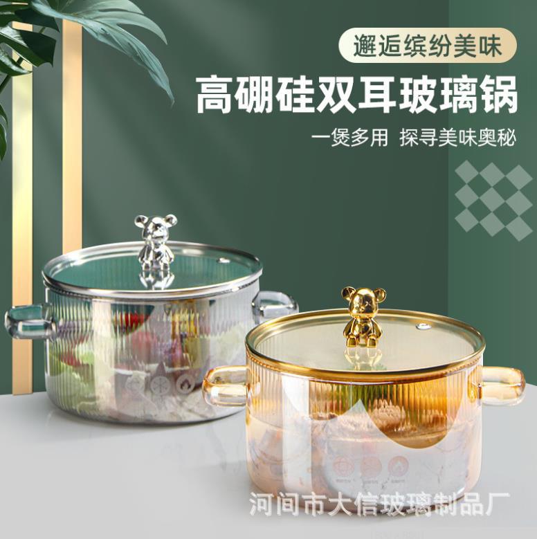 透明縦紋高ホウ素ガラススープ鍋双耳熊ガラス鍋明火加熱大容量ガラスミルク鍋