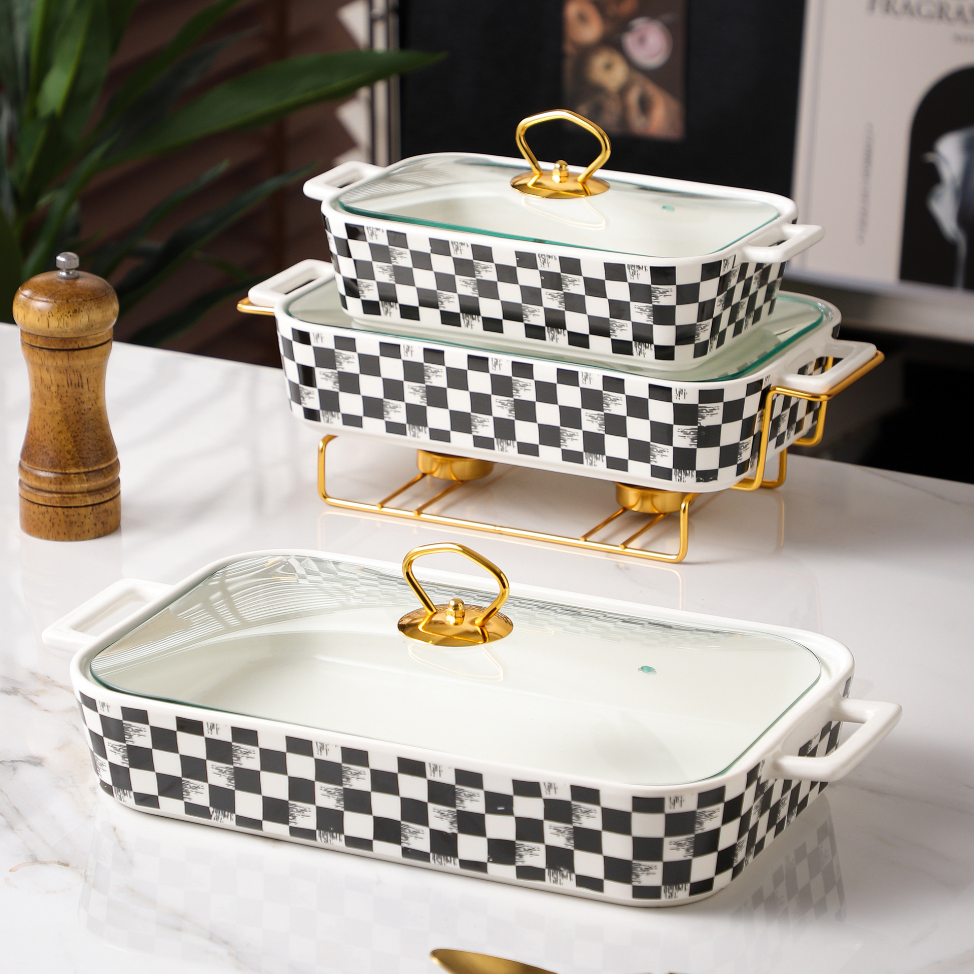 北欧スタイルの黒と白の市松模様のスープポット、鉄フレーム付き、長方形の双耳セラミックポット、家庭用加熱可能な魚皿卸売