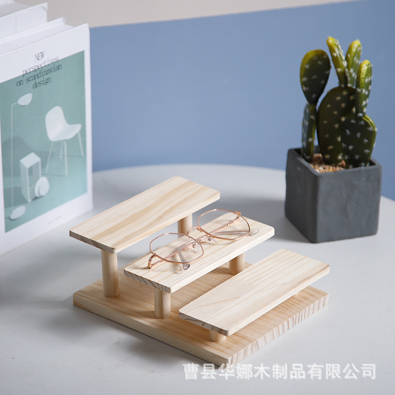 木のメガネフレームの目の店はサングラスのサングラスの近視の鏡のフレームのスタンドの公仔の手を陳列して多層の展示棚をします。