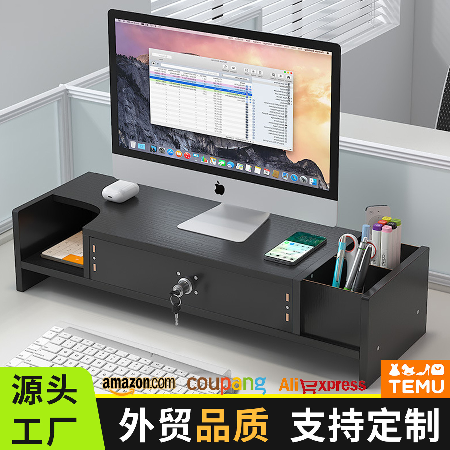 コンピュータのディスプレイが高くなっています。ロック付きの引き出しがあります。