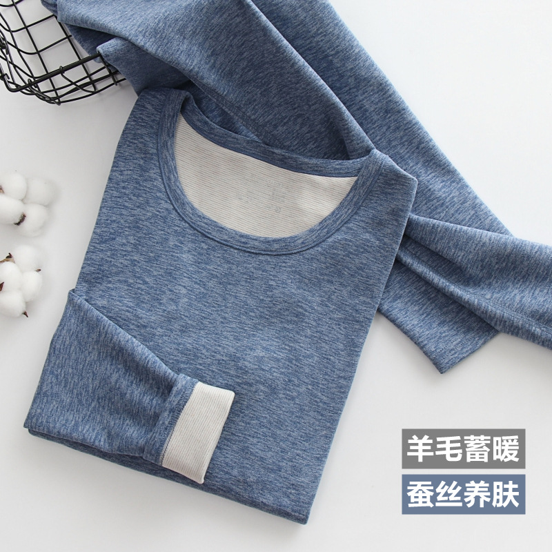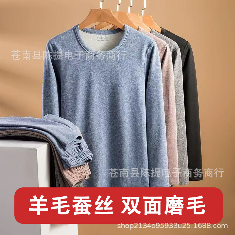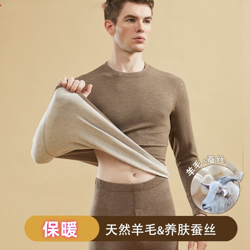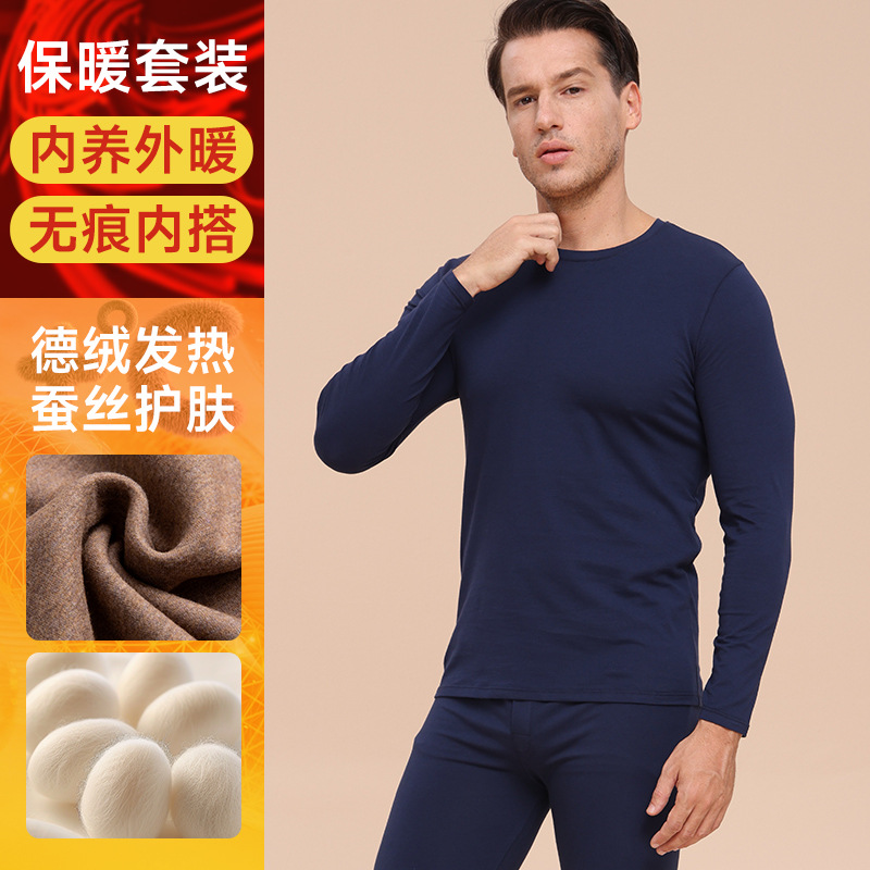 新しいカシミヤシルク保温下着男性セット丸首防寒ベルベット底保温服