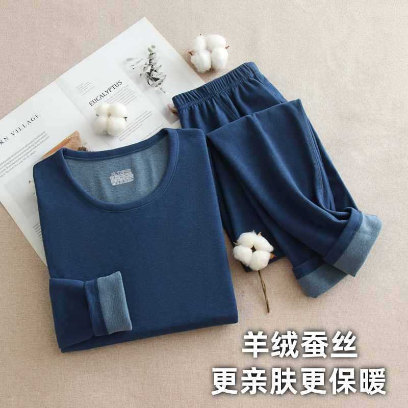 【カシミヤ絹糸】両面パイル男女性丸首保温下着セット秋衣秋ズボン修身徳パイル