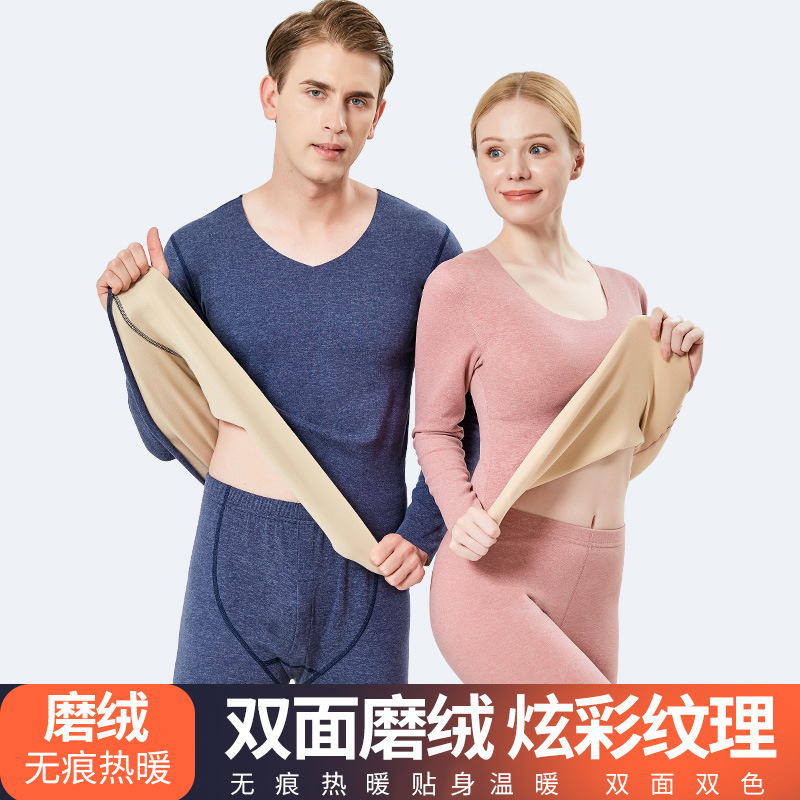 秋冬厚手両面磨毛新磨絨無痕保温下着男性女性カップルスーツ秋衣秋ズボン高弾