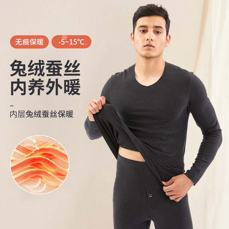 工場直送 メンズ ラビットファー シルク シームレス セット 秋冬新作 厚手 保温下着 卸売 丸首 秋服 秋ズボン