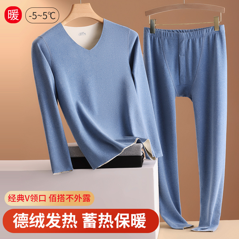 男性のデフリース保温下着vネック無痕底綿セーター秋冬両面磨毛秋衣秋ズボンセット