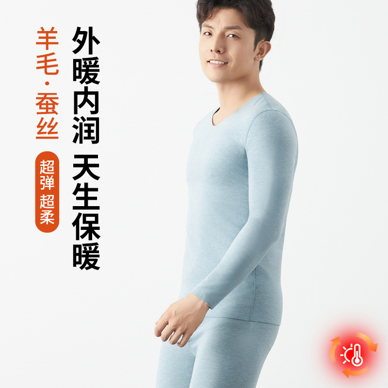 秋冬100% 超細いウール男性下着カバー純色保温底秋衣秋ズボン丸襟パジャマセット