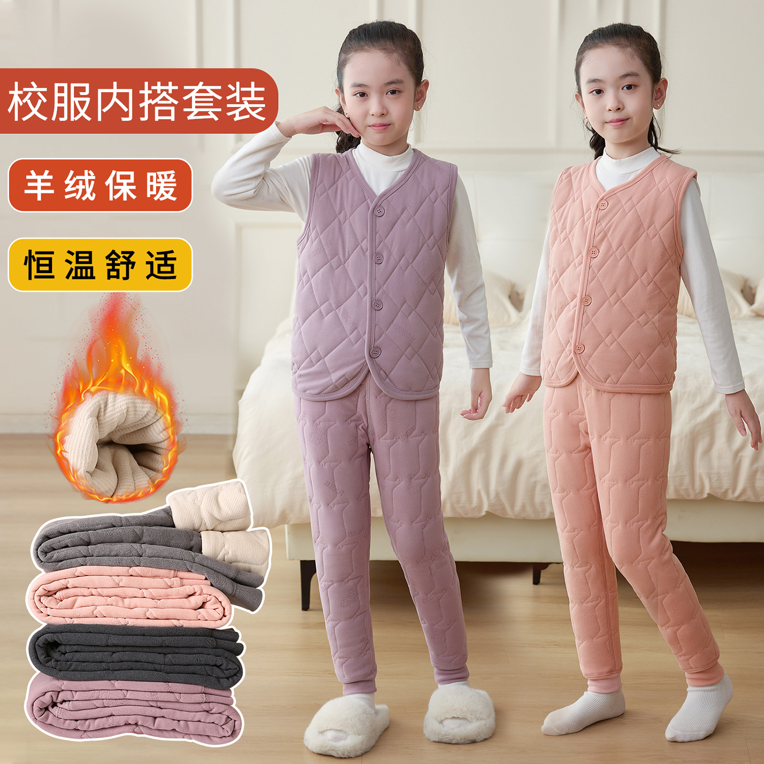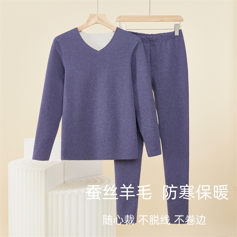秋冬両面パイル保温ウール下着セットカップル秋衣秋ズボンシルクパッチ保温下着