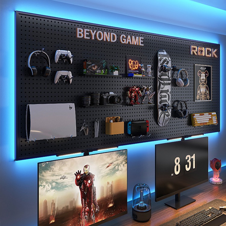 電気競争の部屋の穴の板の黒い壁の棚の書斎の上のコンピュータの机の壁面は板を掛けて鉄の芸の装飾を収納します。