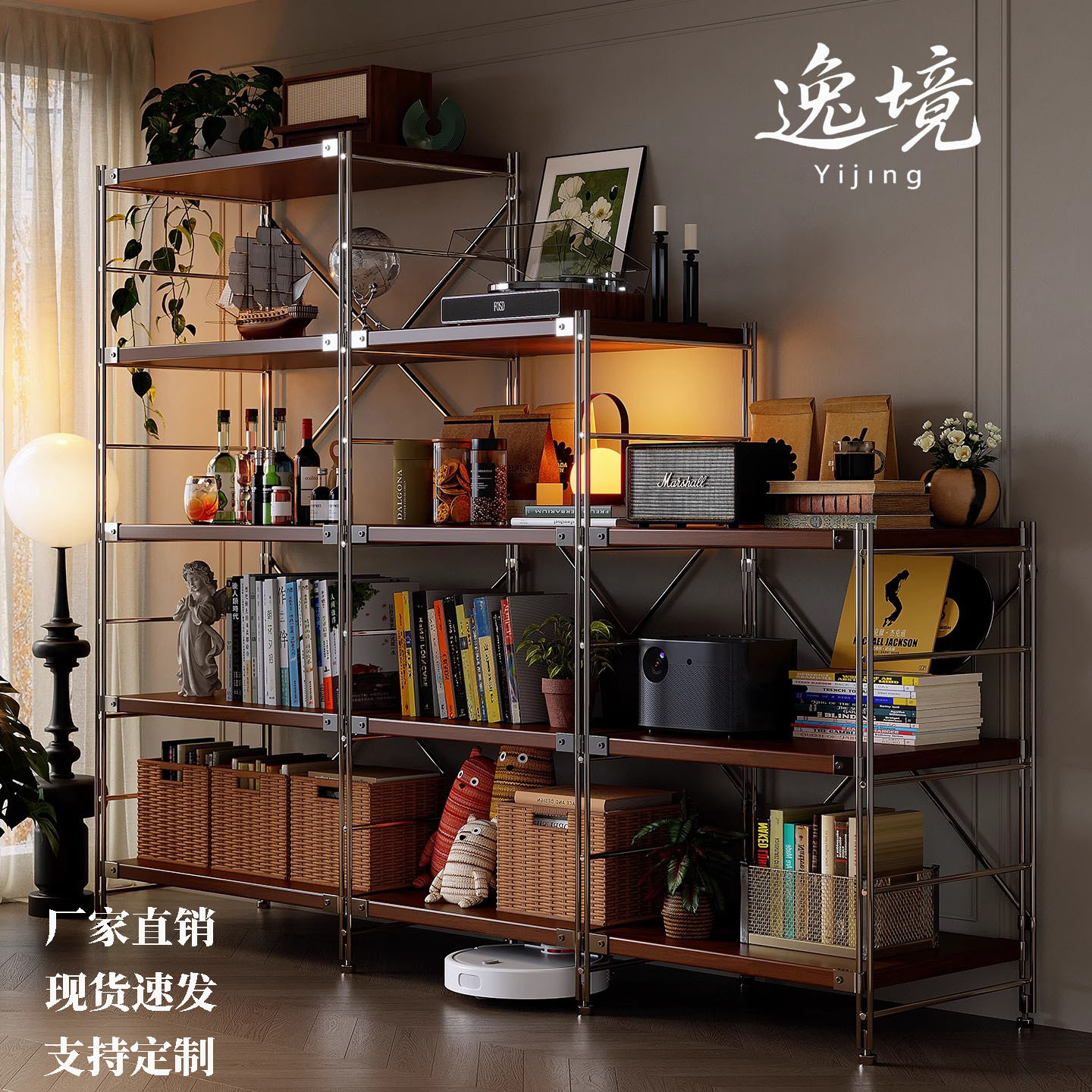 アルミ合金棚内蔵発光led照明シンプル本棚軽豪華金属仕切り板一字展示棚板