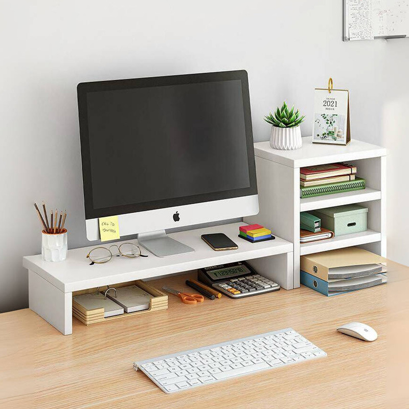 デスクトップコンピュータディスプレイが高くなっています。ベースブラケットのオフィスデスクの棚を整理して収納します。