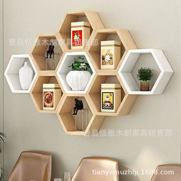 木製六角形壁掛け収納ラック、ハニカム格子棚、壁掛けラック、無垢材壁装飾収納ラック