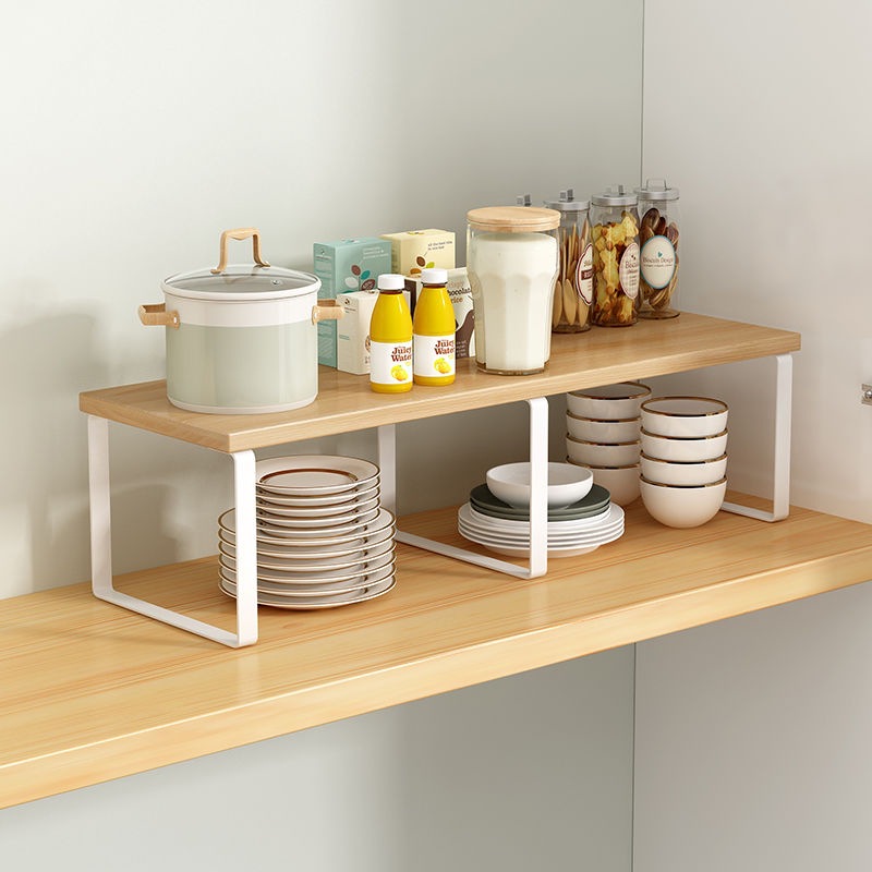 台所の棚を高くして棚を高くして、戸棚の中の仕切りの調味料の皿の鍋を収納します。