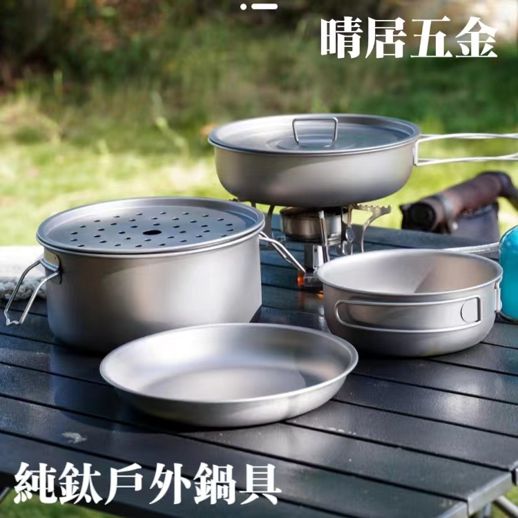 純チタン製アウトドア蒸し器4.5L携帯スープポットキャンプ用鍋野営用フライパン鍋セット軽量